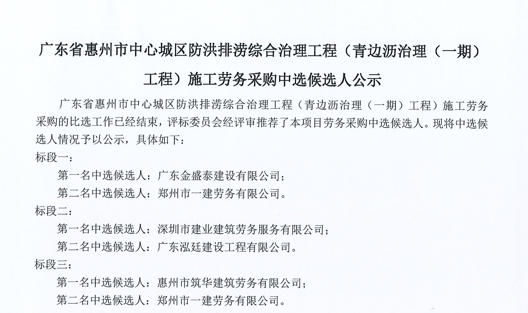 廣東省惠州市中心城區(qū)防洪排澇綜合治理工程(青邊瀝治理(一期)工程)施工勞務(wù)采購(gòu)中選候選人公示......