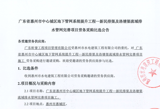 廣東省惠州市中心城區(qū)地下管網(wǎng)系統(tǒng)提升工程—新民排渠及洛塘渠流域排水管網(wǎng)完善項目勞務(wù)采購比選公告......