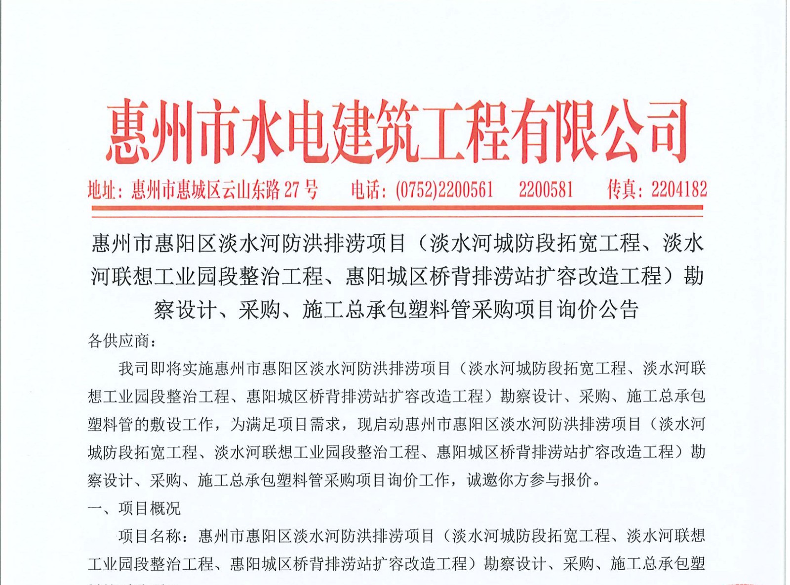 附件:惠州市惠陽區(qū)淡水河防洪排澇項目(淡水河城防段拓寬工程、淡水河聯(lián)想工業(yè)園段整治工程、惠陽城區(qū)橋背排澇站擴容改造工程) 勘察設(shè)計、采購、施工總承包塑料管采購項目詢價報價表......