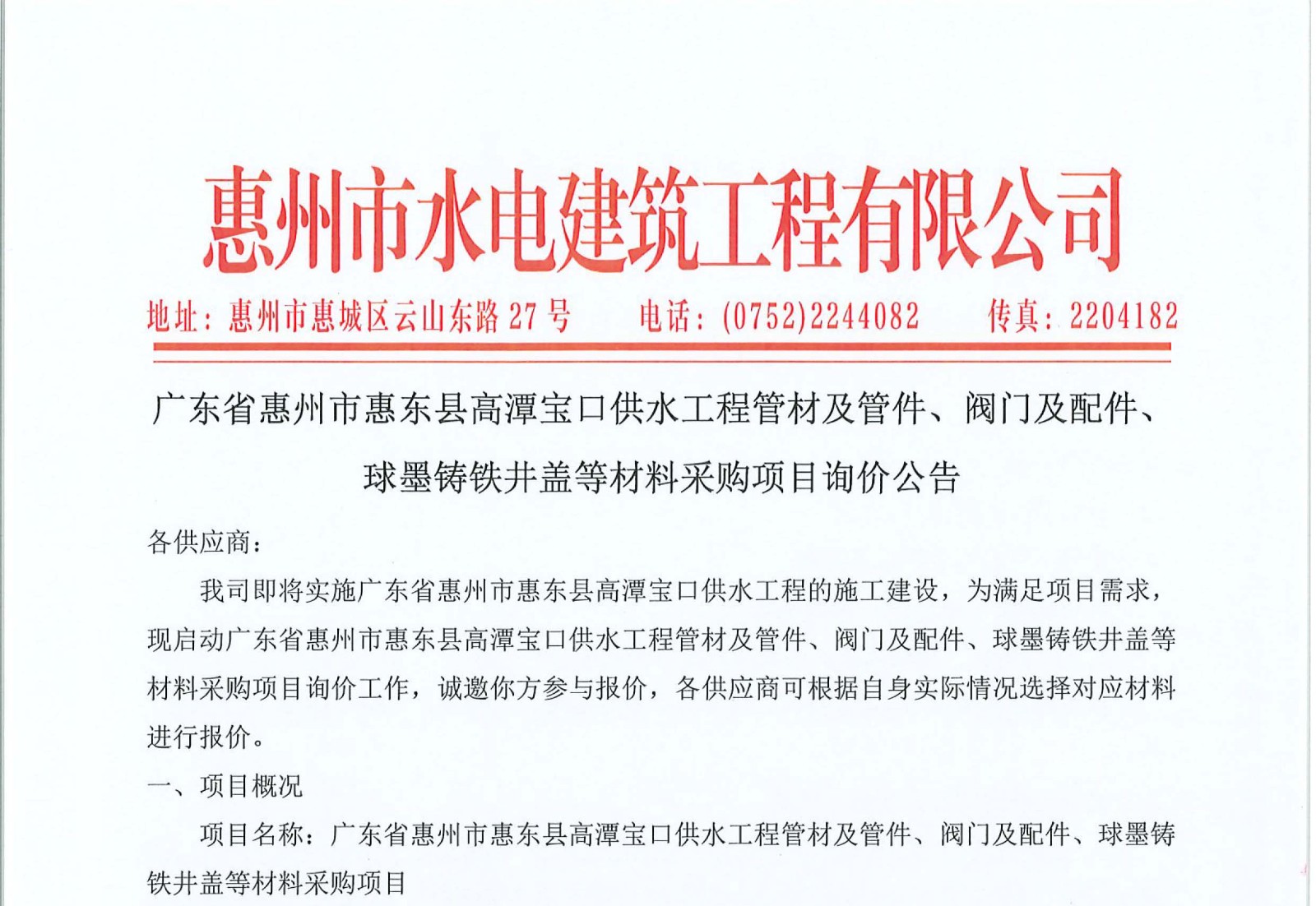 附件:廣東省惠州市惠東縣高潭寶口供水工程施工管材及管件、閥門及配件、球墨鑄鐵井蓋等材料采購項目詢價報價表......