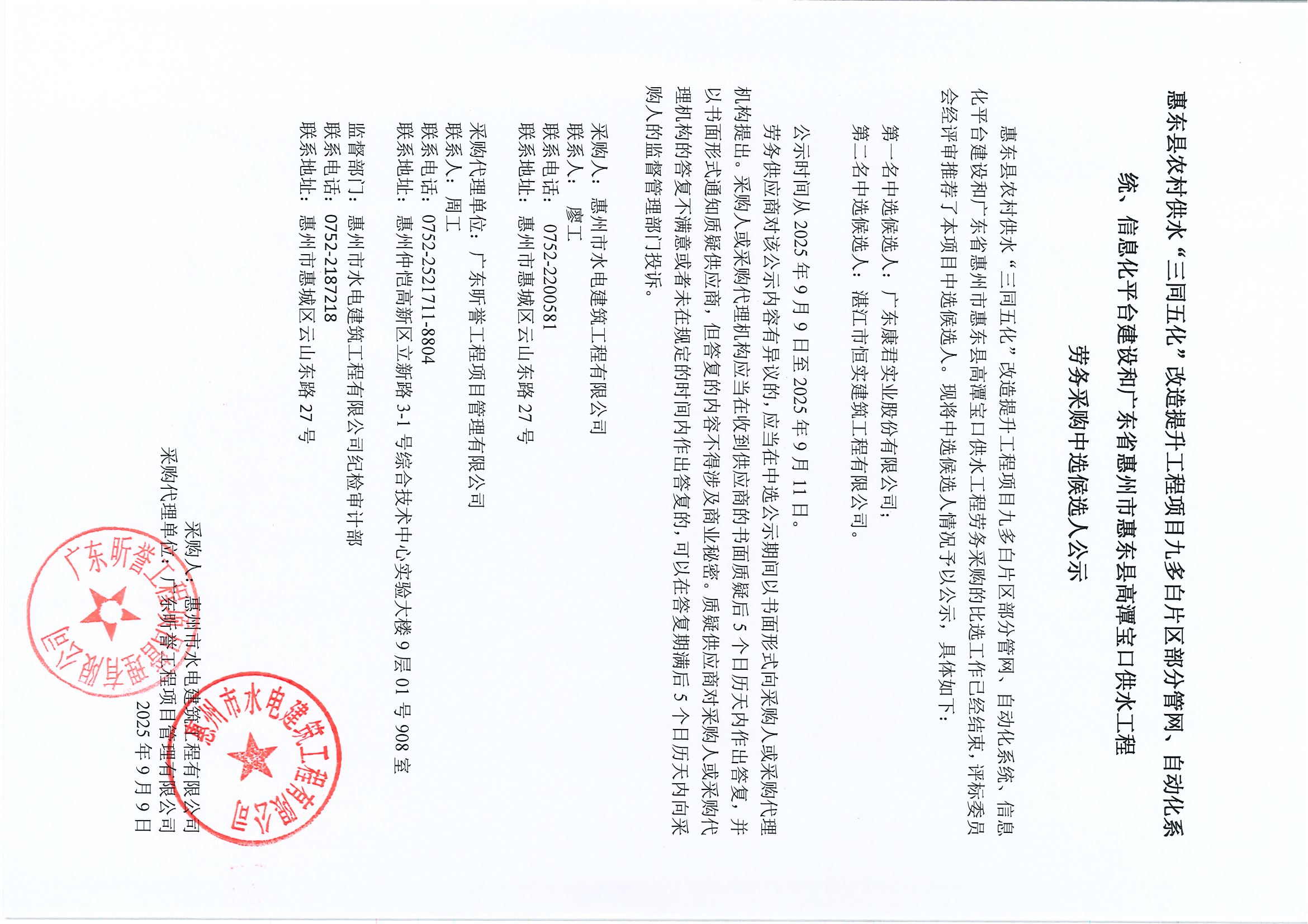 惠東縣農(nóng)村供水“三同五化”改造提升工程項目九多白片區(qū)部分管網(wǎng)、自動化系統(tǒng)、信息化平臺建設(shè)和廣東省惠州市惠東縣高潭寶口供水工程勞務(wù)采購中選候選人公示