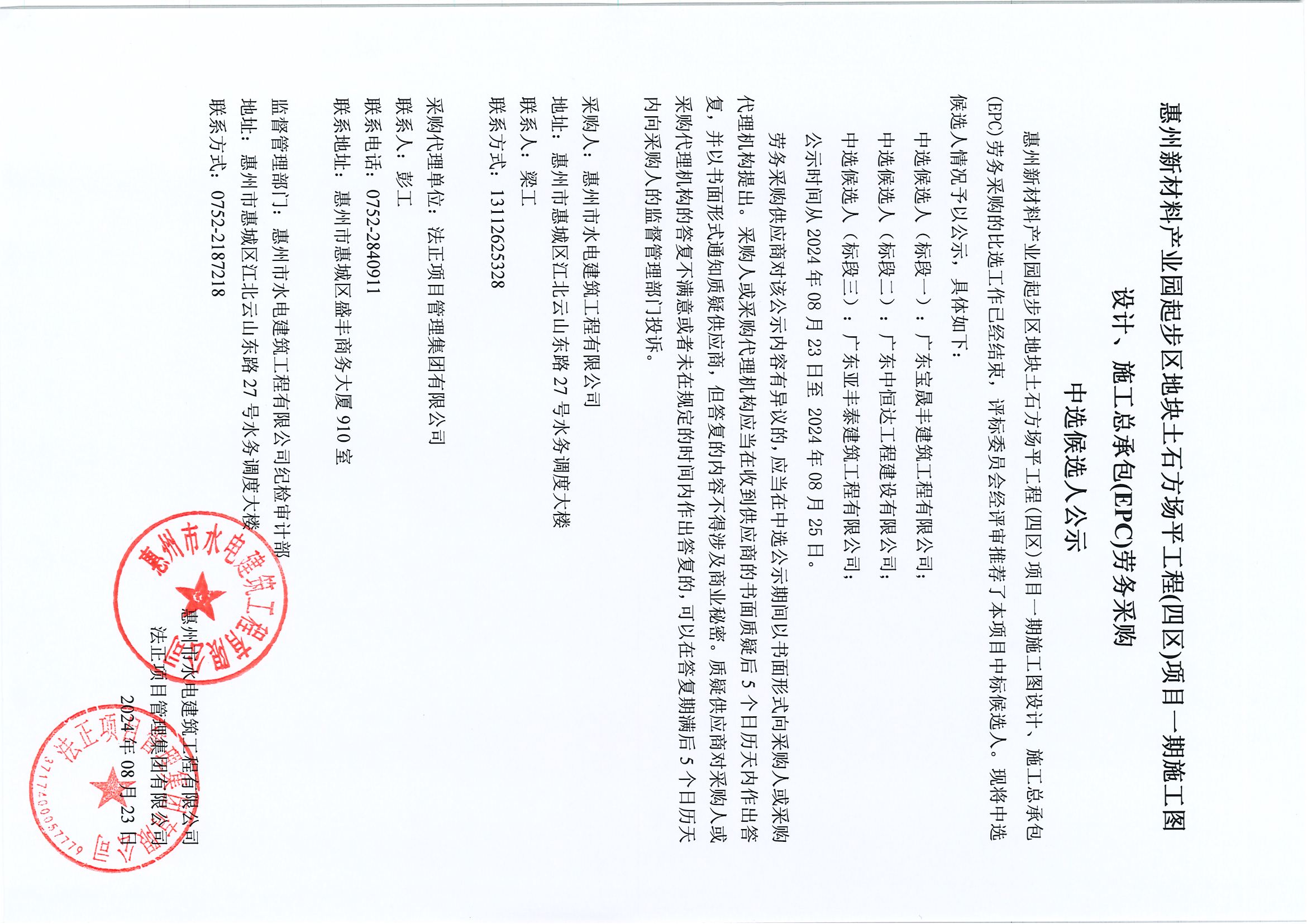 惠州新材料產(chǎn)業(yè)園起步區(qū)地塊土石方場平工程(四區(qū))項目一期施工圖設計、施工總承包(EPC)勞務采購中選候選人公示