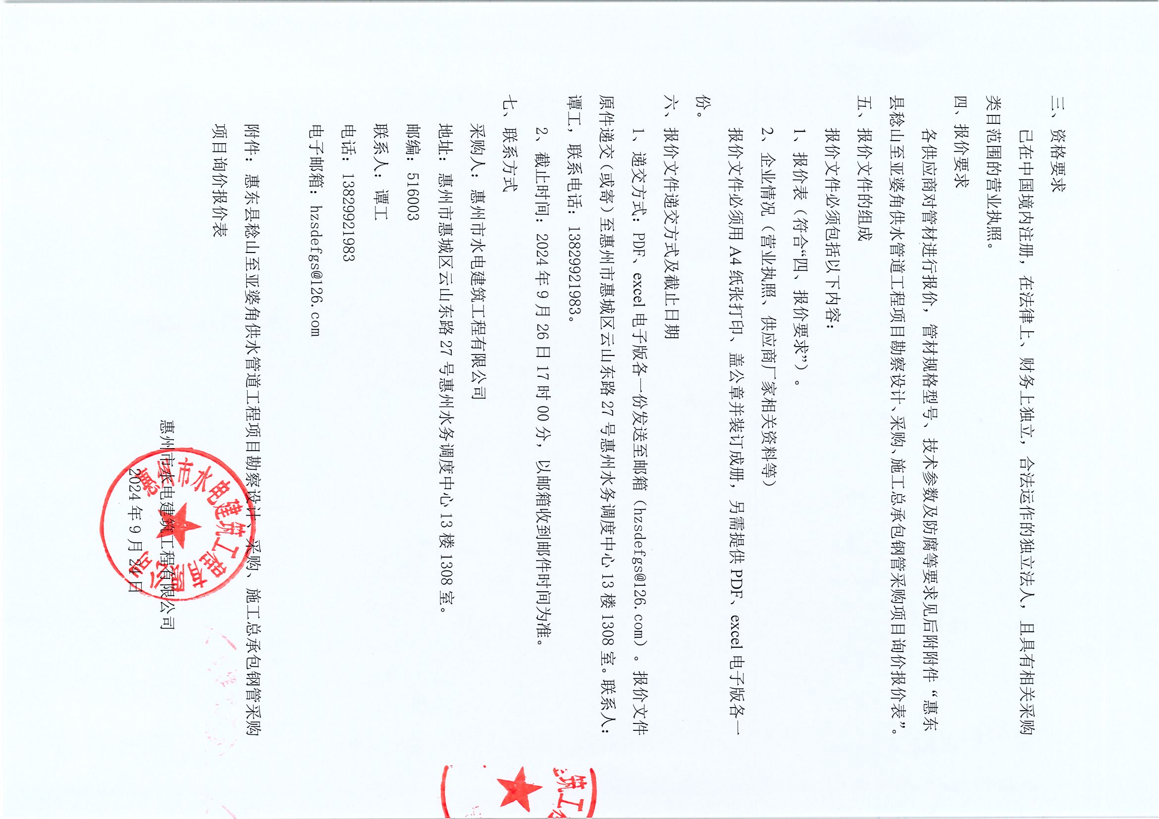 惠東縣稔山至亞婆角供水管道工程項(xiàng)目勘察設(shè)計(jì)、采購(gòu)、施工總承包鋼管采購(gòu)項(xiàng)目詢價(jià)公告