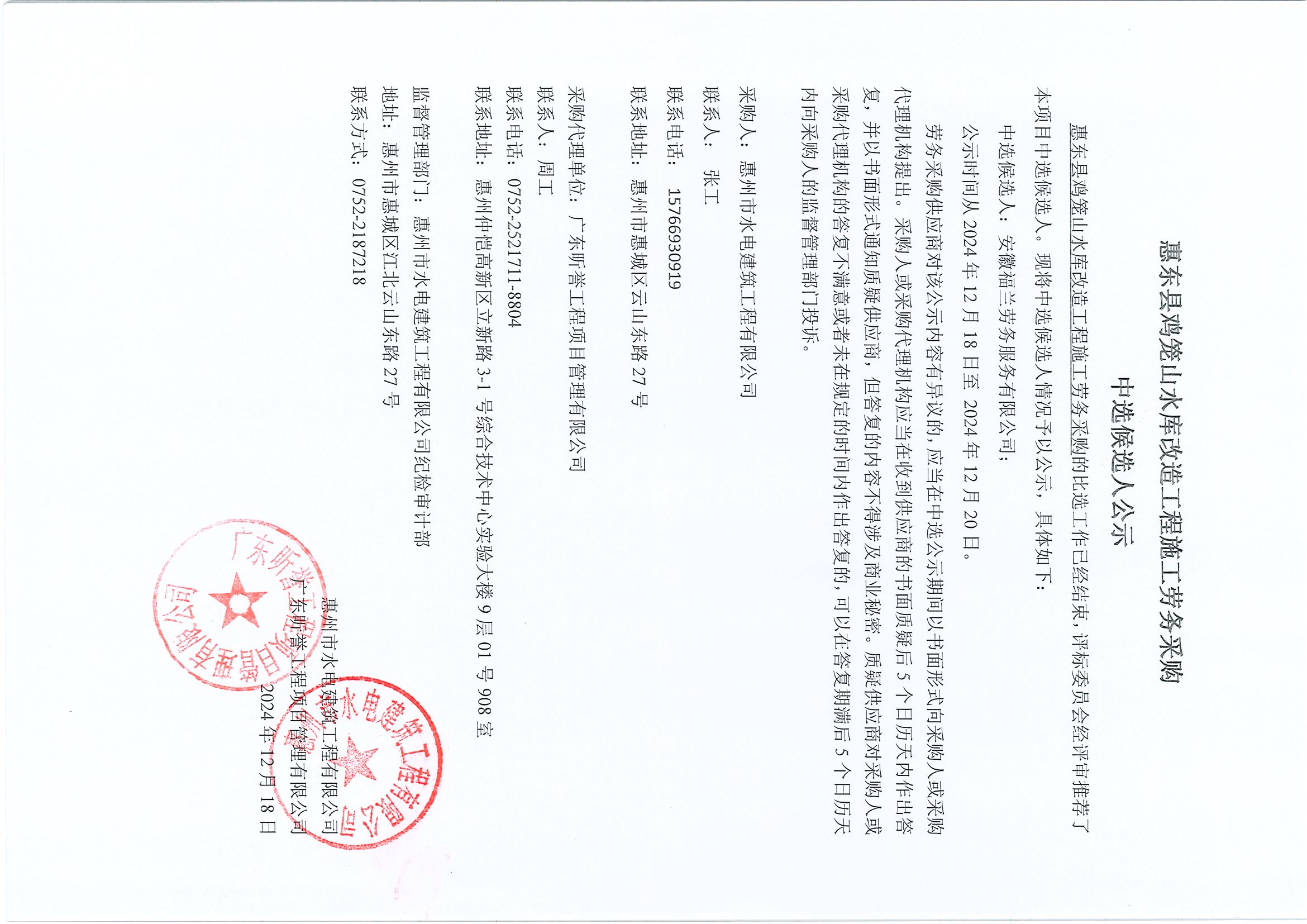 惠東縣雞籠山水庫改造工程施工勞務采購中選候選人公示
