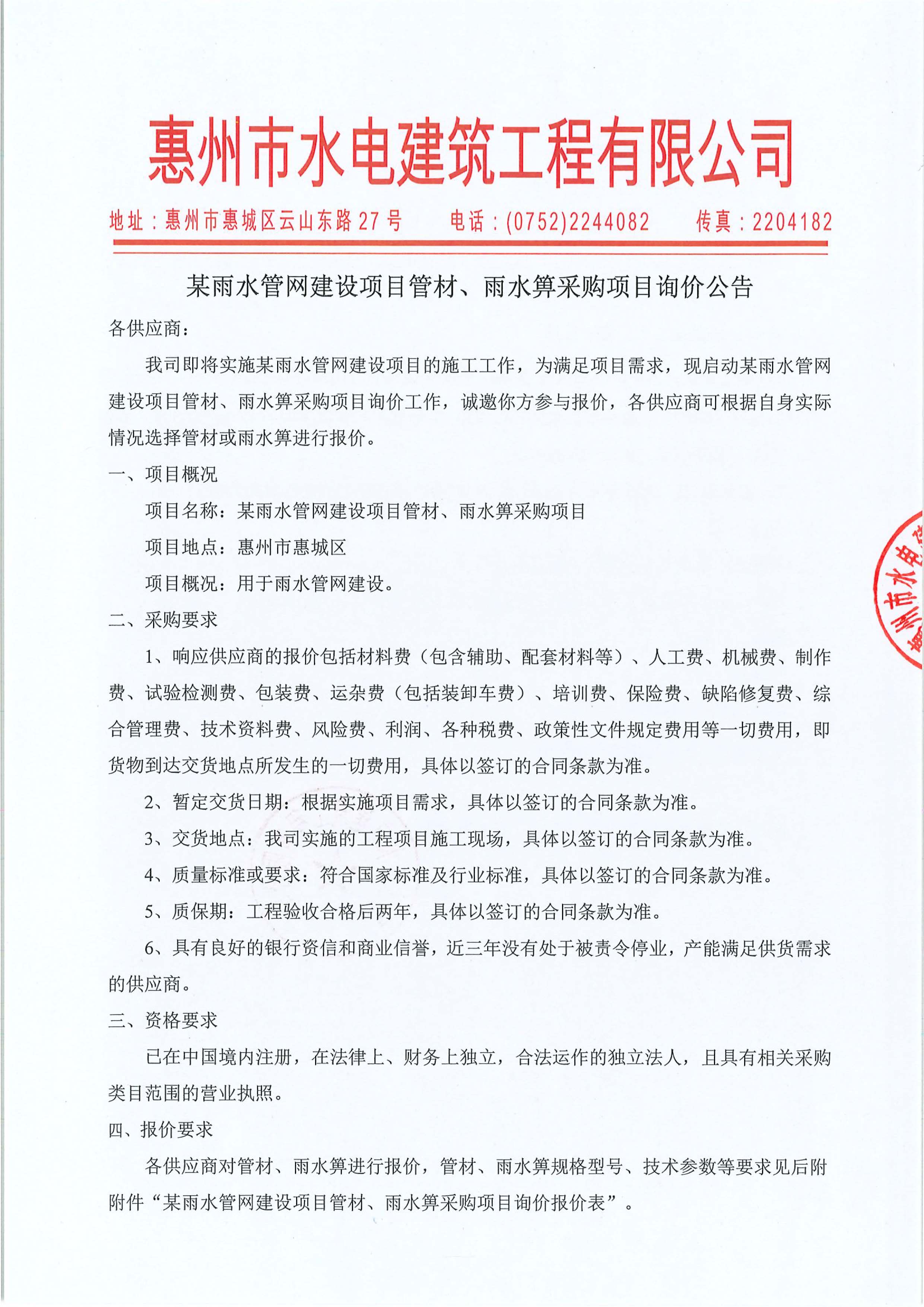 某雨水管網(wǎng)建設(shè)項目管材、雨水箅采購項目詢價公告