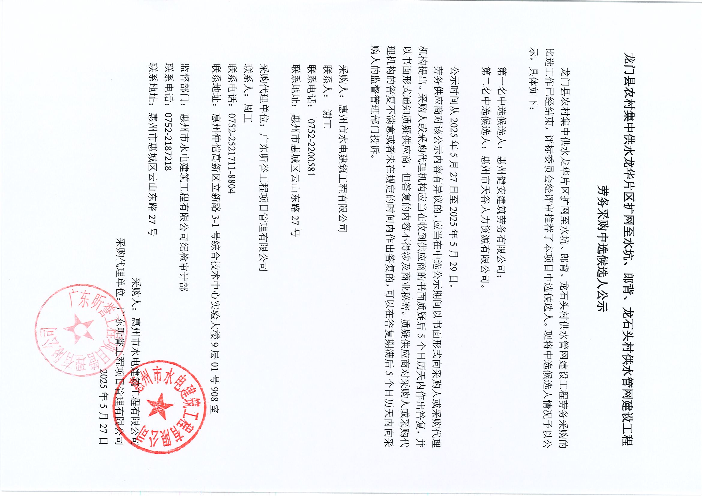龍門縣農(nóng)村集中供水龍華片區(qū)擴網(wǎng)至水坑、郎背、龍石頭村供水管網(wǎng)建設(shè)工程勞務(wù)采購中選候選人公示