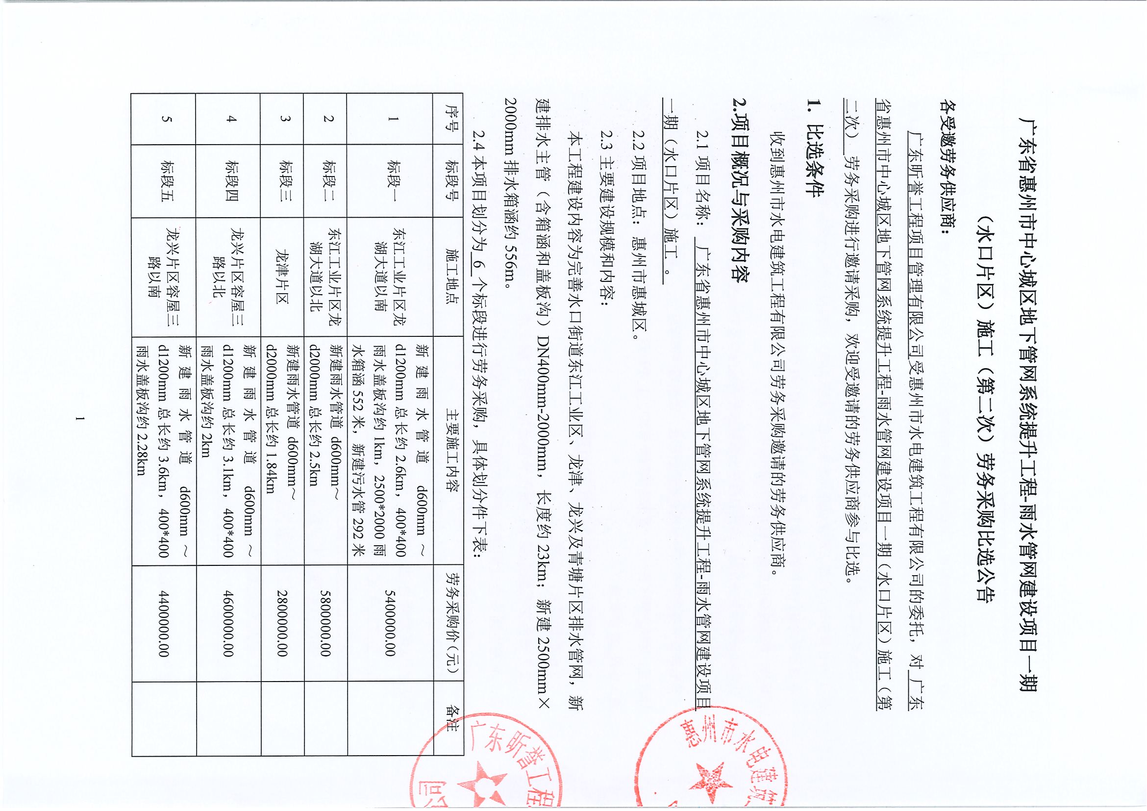 廣東省惠州市中心城區(qū)地下管網(wǎng)系統(tǒng)提升工程-雨水管網(wǎng)建設項目一期(水口片區(qū))施工(第二次)勞務采購比選公告