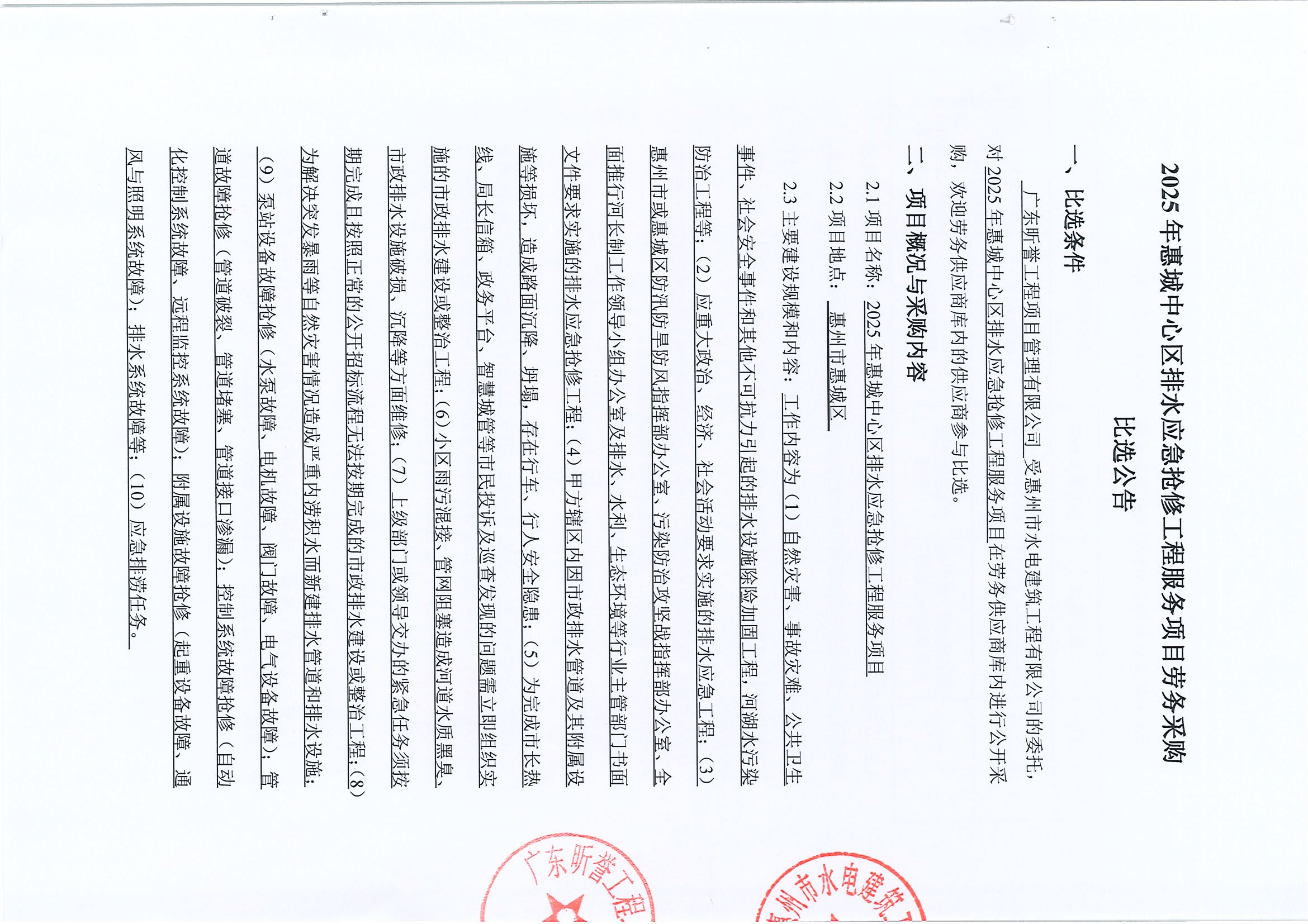 2025年惠城中心區(qū)排水應(yīng)急搶修工程服務(wù)項目勞務(wù)采購比選公告