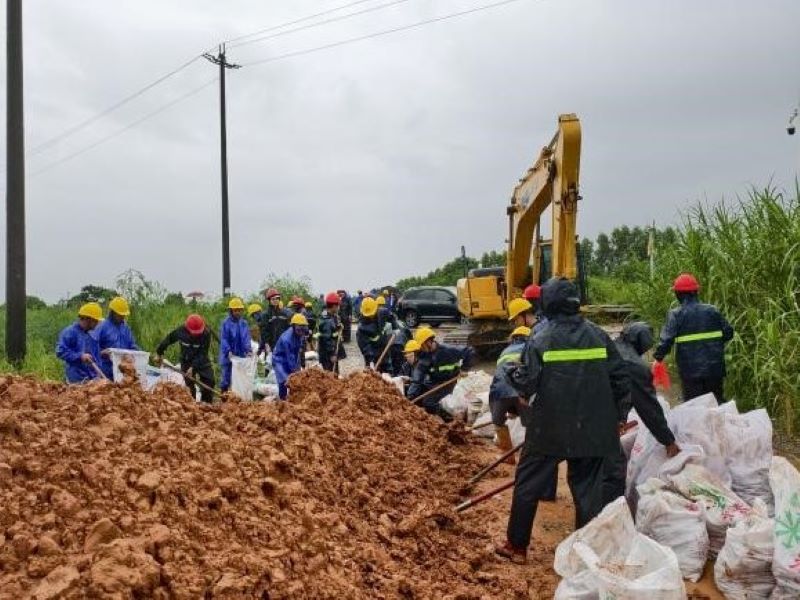 在潼湖崗頭新圍,8月5日早上,公司接到赴潼湖崗頭新圍搶險(xiǎn)命令,搶險(xiǎn)隊(duì)70人立即集結(jié)待命,完成應(yīng)急搶險(xiǎn)安全技術(shù)交底工作后乘車前往仲愷高新區(qū)潼湖崗頭新圍開展子堤加高加固搶險(xiǎn)。公司總工程師謝武帶隊(duì)趕赴險(xiǎn)情現(xiàn)場勘查,研討搶險(xiǎn)方案,指導(dǎo)搶險(xiǎn)工作。12時30分,搶險(xiǎn)人員、機(jī)械設(shè)備和搶險(xiǎn)物資已到達(dá)現(xiàn)場第一作業(yè)點(diǎn)開展搶險(xiǎn)。因連日降雨,現(xiàn)場河水水位高漲幾近漫堤,險(xiǎn)情非常緊急。搶險(xiǎn)隊(duì)員或鏟裝沙袋、或搬運(yùn)堆砌、或機(jī)械清障,大家分工協(xié)作,有條不紊開展子堤加高。經(jīng)過全員不懈努力,僅用4個小時,第一搶險(xiǎn)點(diǎn)子堤加高加固就已完成,順利完成搶險(xiǎn)任務(wù)。