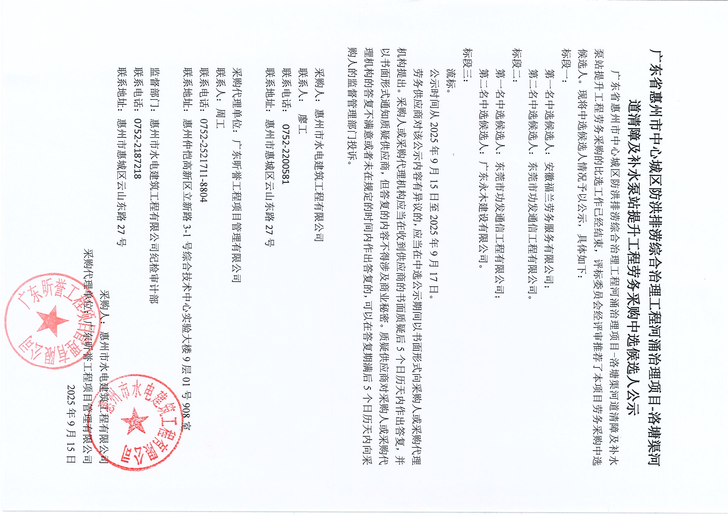廣東省惠州市中心城區(qū)防洪排澇綜合治理工程河涌治理項(xiàng)目-洛塘渠河道清障及補(bǔ)水泵站提升工程勞務(wù)采購(gòu)中選候選人公示