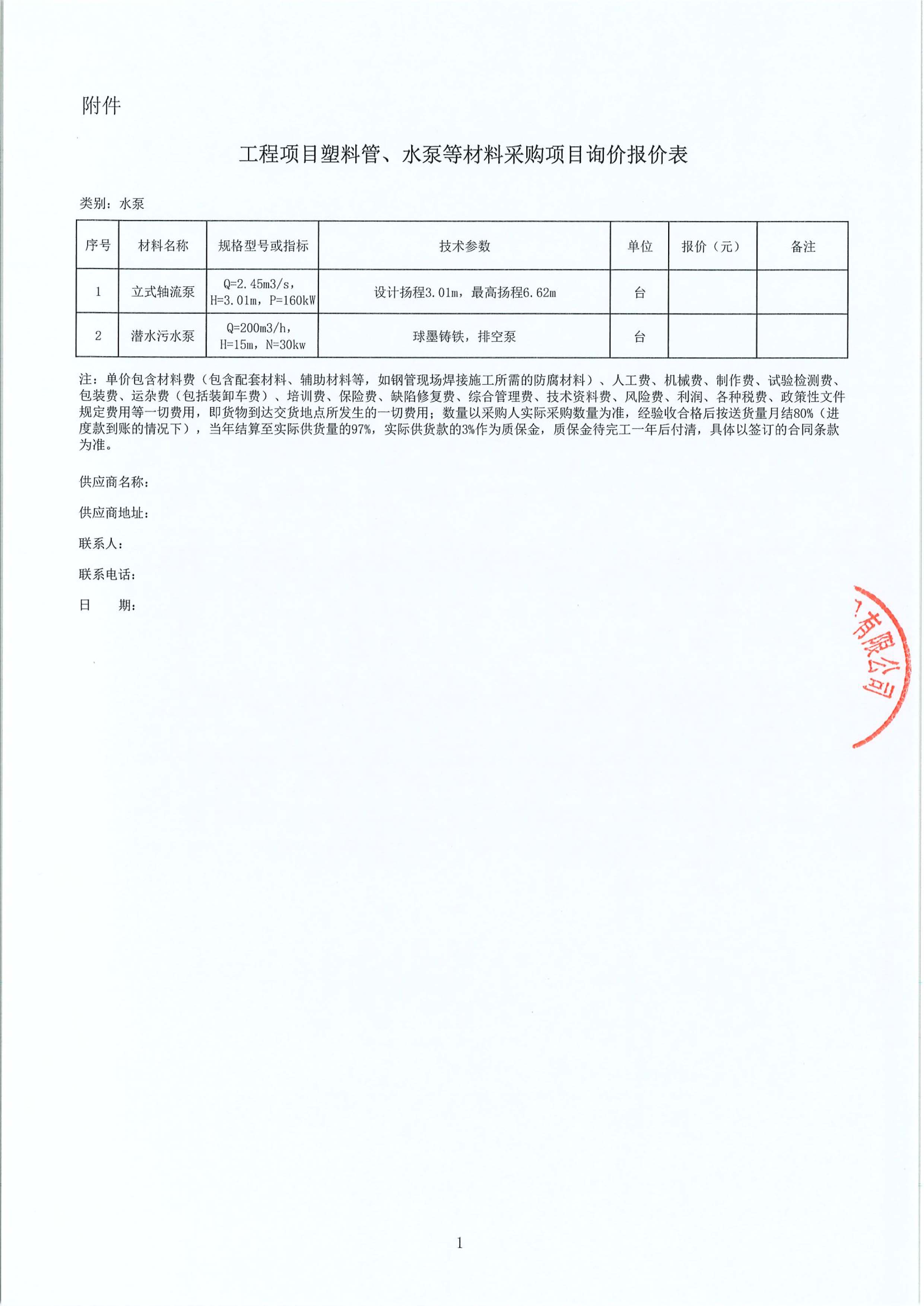 工程項目塑料管、水泵等材料采購項目詢價公告附件: