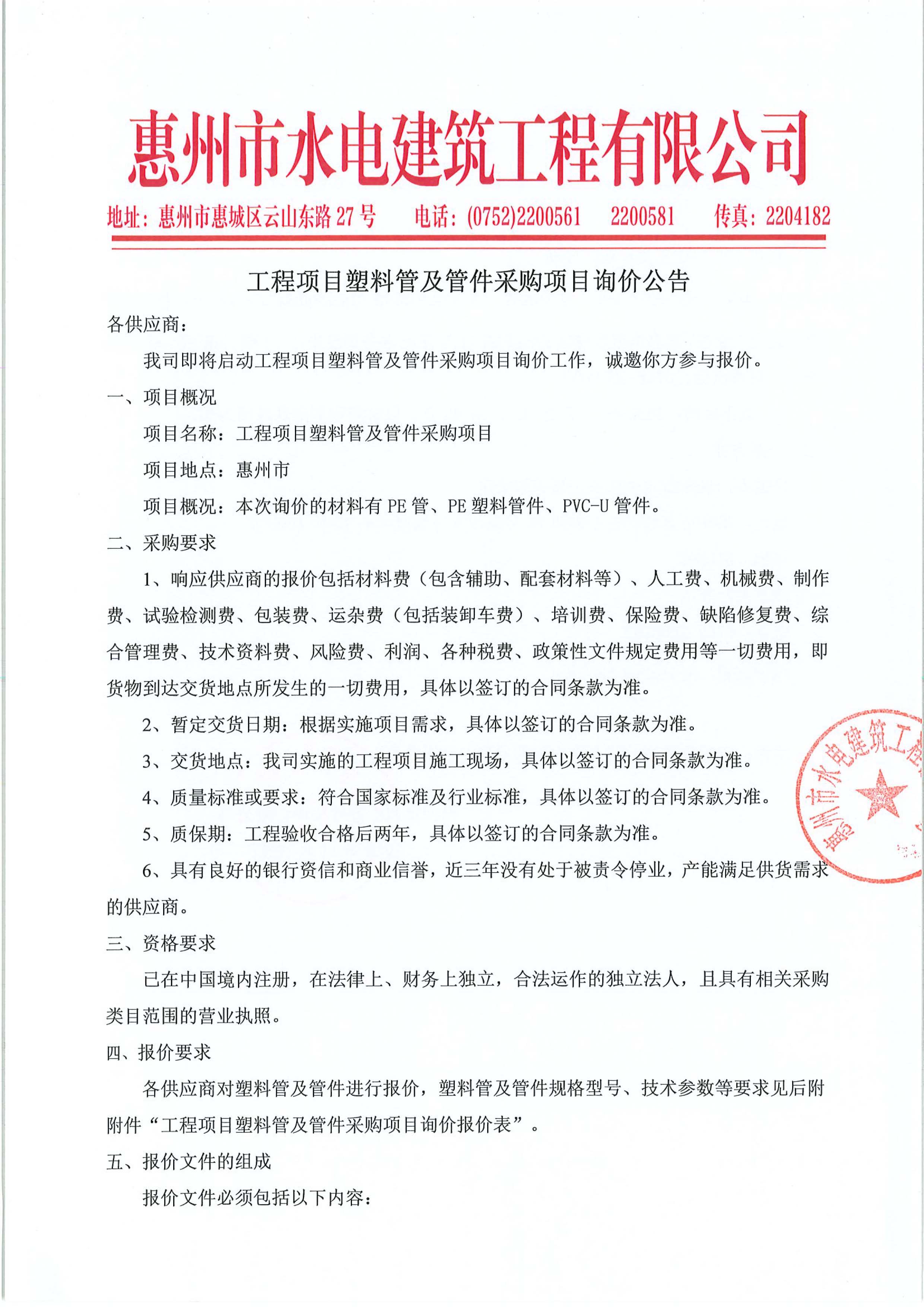 惠州市水電建筑工程有限公司2025年度非開挖修復(fù)材料采購(gòu)項(xiàng)目(第二次)詢價(jià)公告
