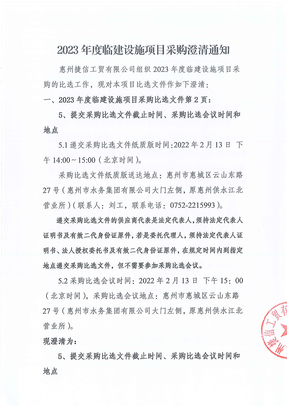 捷信工貿(mào)公司2023年度臨建設(shè)施項目采購澄清通知