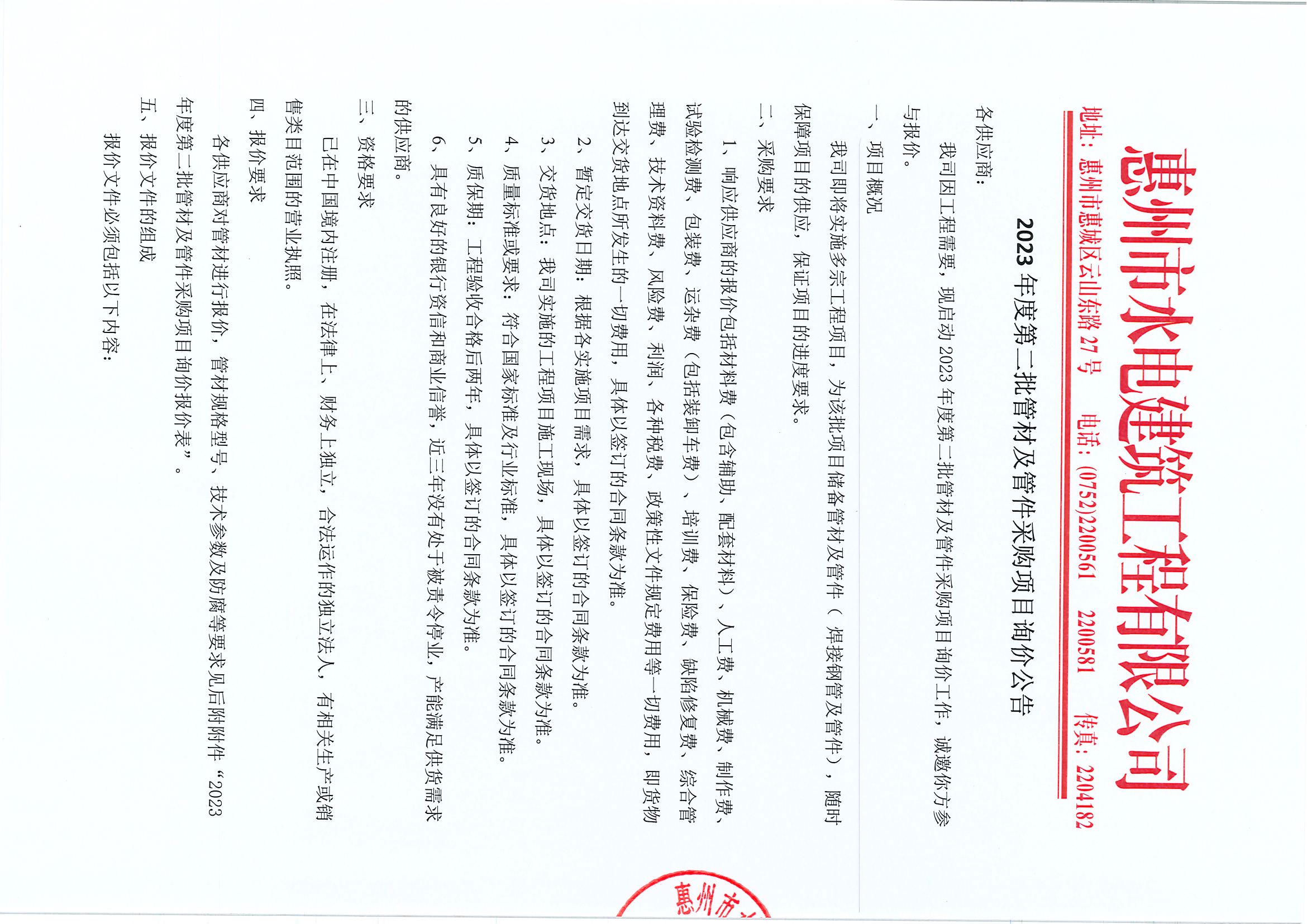捷信工貿(mào)公司2023年度第一批管材及管件采購項目(標段一)(第二次)招標公告