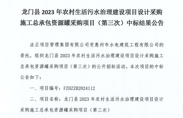 龍門縣2023年農(nóng)村生活污水治理建設(shè)項(xiàng)目設(shè)計(jì)采購施工總承包資源罐采購項(xiàng)目(第三次)中標(biāo)結(jié)果公告......