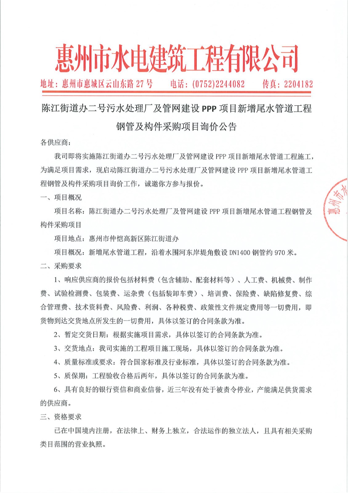 陳江街道辦二號污水處理廠及管網(wǎng)建設(shè)PPP項目新增尾水管道工程鋼管及構(gòu)件采購項目第二次詢價公告附件:/upload/202412/09/202412091458001110.xls......