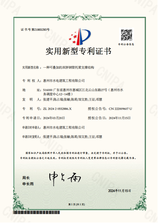近日,由我司自主研發(fā)的“一種可疊加的雙拼鋼管托梁支撐結構”獲國家知識產權局授予實用新型專利證書,標志著公司在創(chuàng)新發(fā)展的道路上又向前邁進堅實一步。